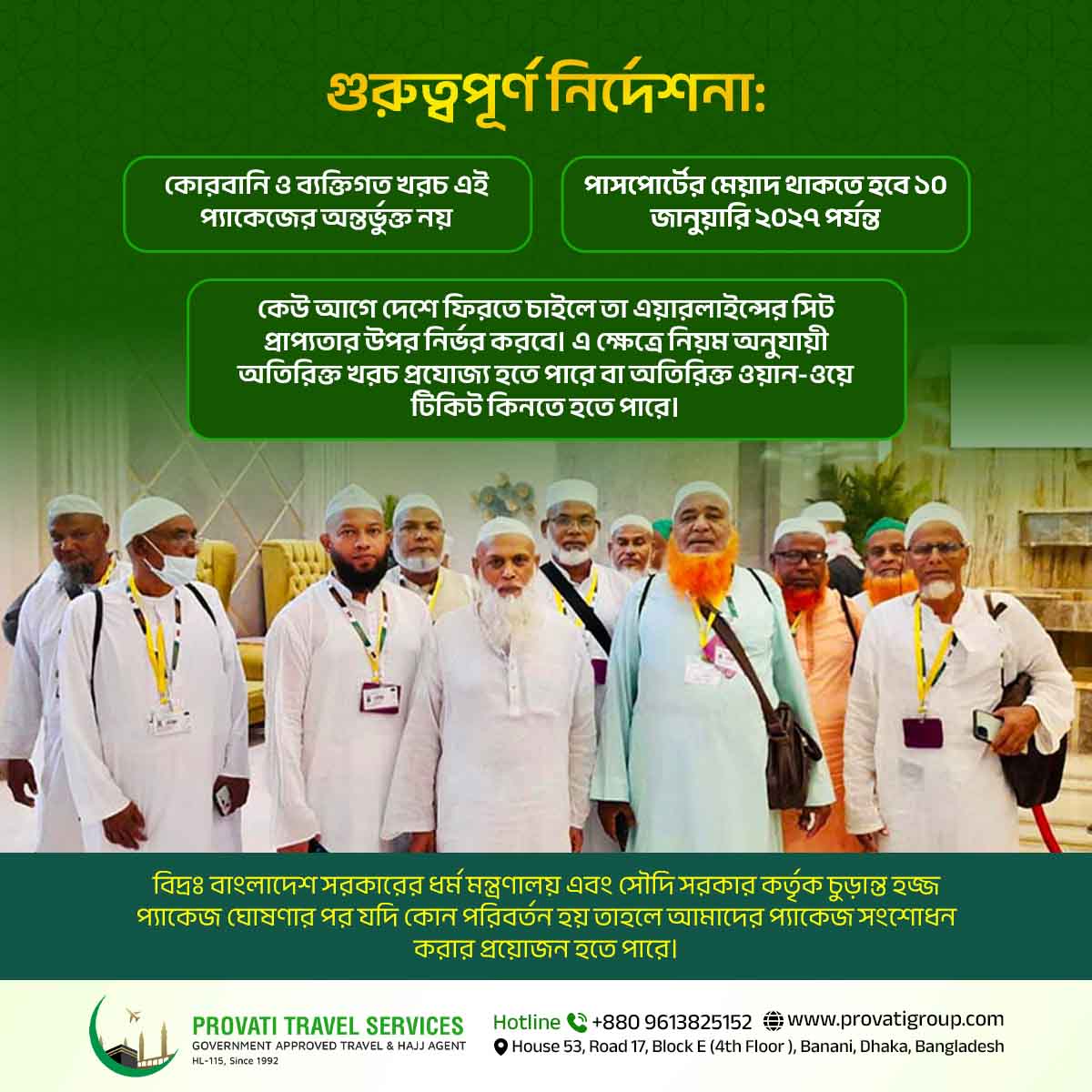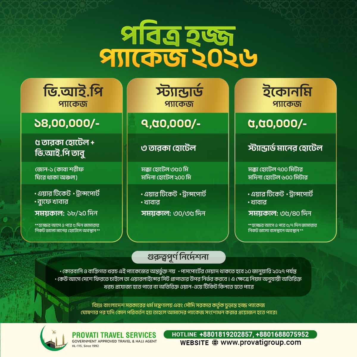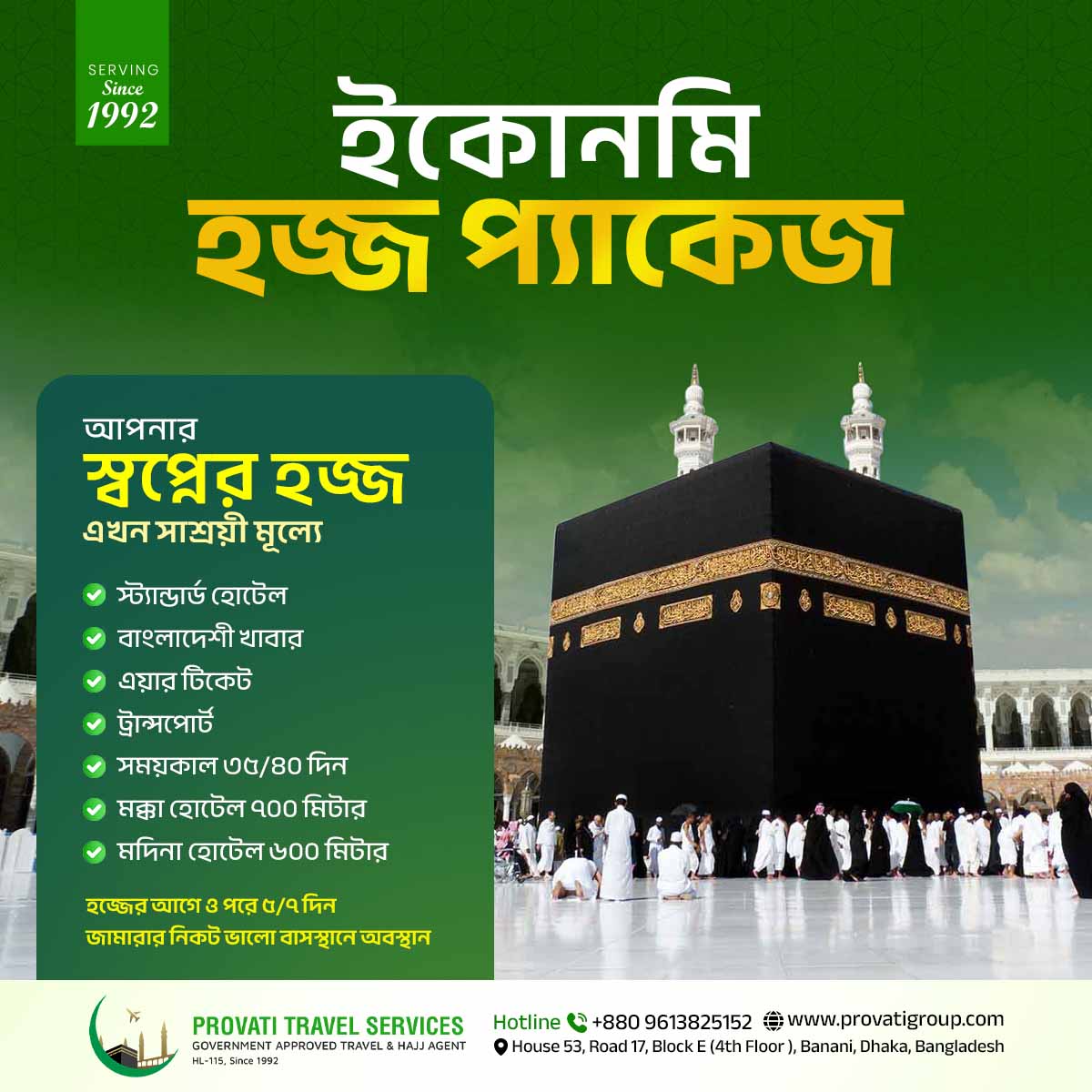 The final package details will be announced after the Ministry of Religious Affairs of the Government of Bangladesh and the Saudi Government publish their official Hajj package. If you are interested, please contact us for more information.