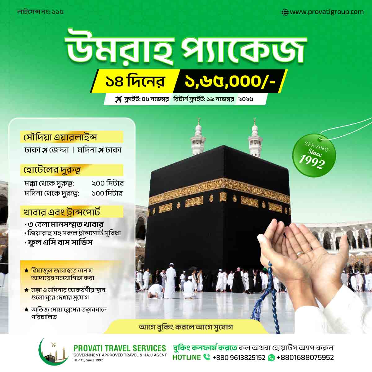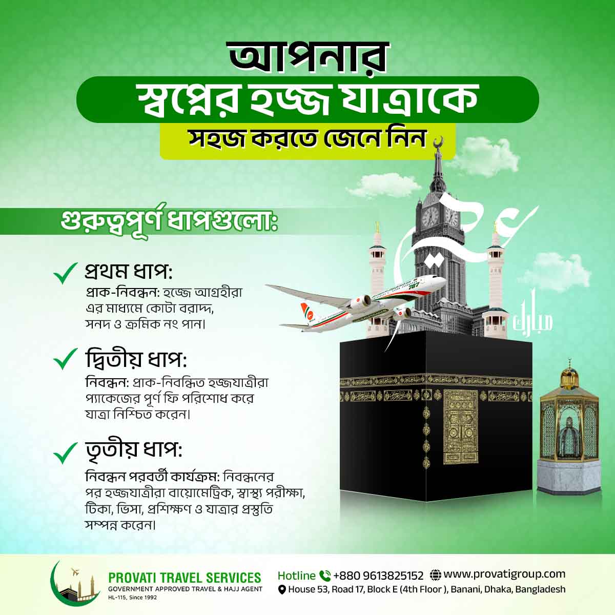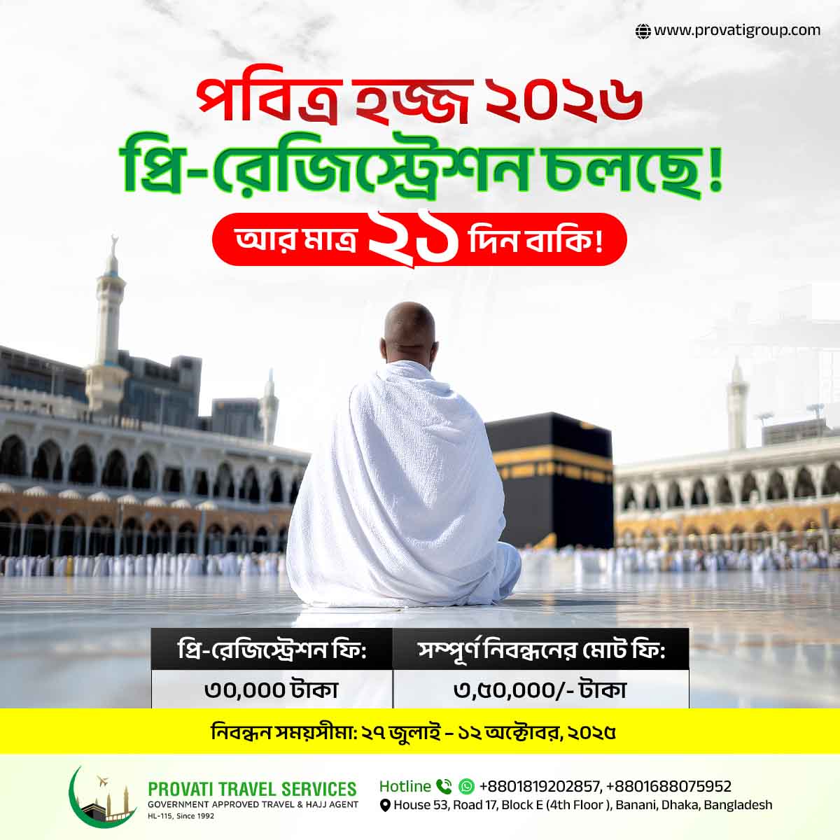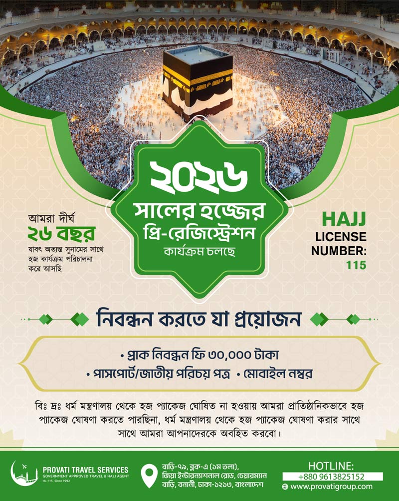The final package details will be announced after the Ministry of Religious Affairs of the Government of Bangladesh and the Saudi Government publish their official Hajj package. If you are interested, please contact us for more information.