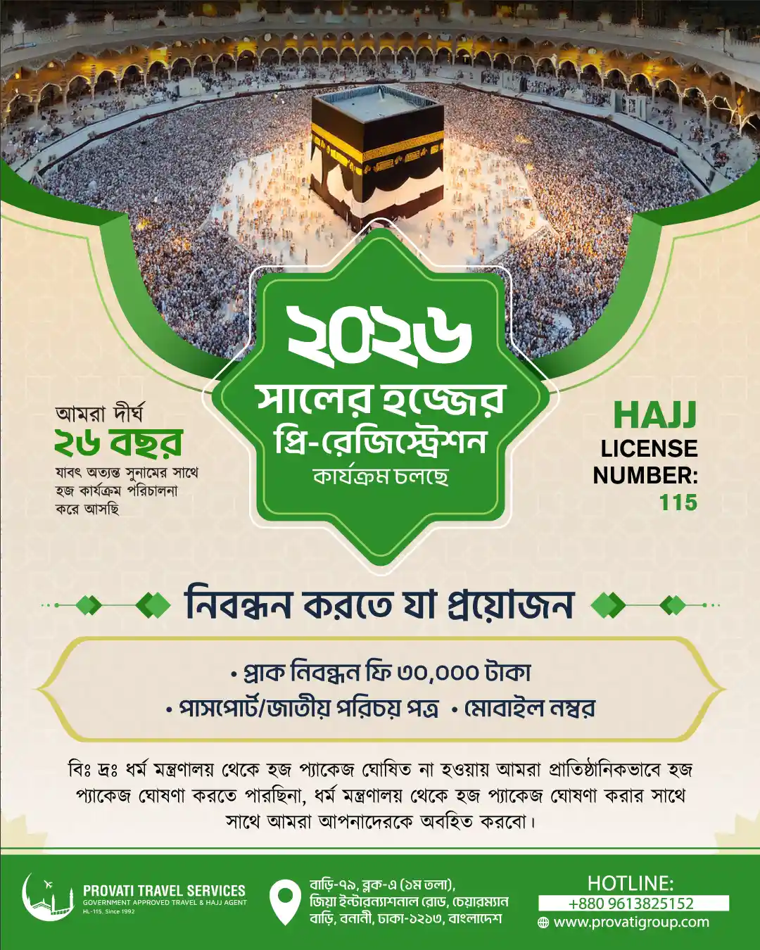 The final package details will be announced after the Ministry of Religious Affairs of the Government of Bangladesh and the Saudi Government publish their official Hajj package. If you are interested, please contact us for more information.